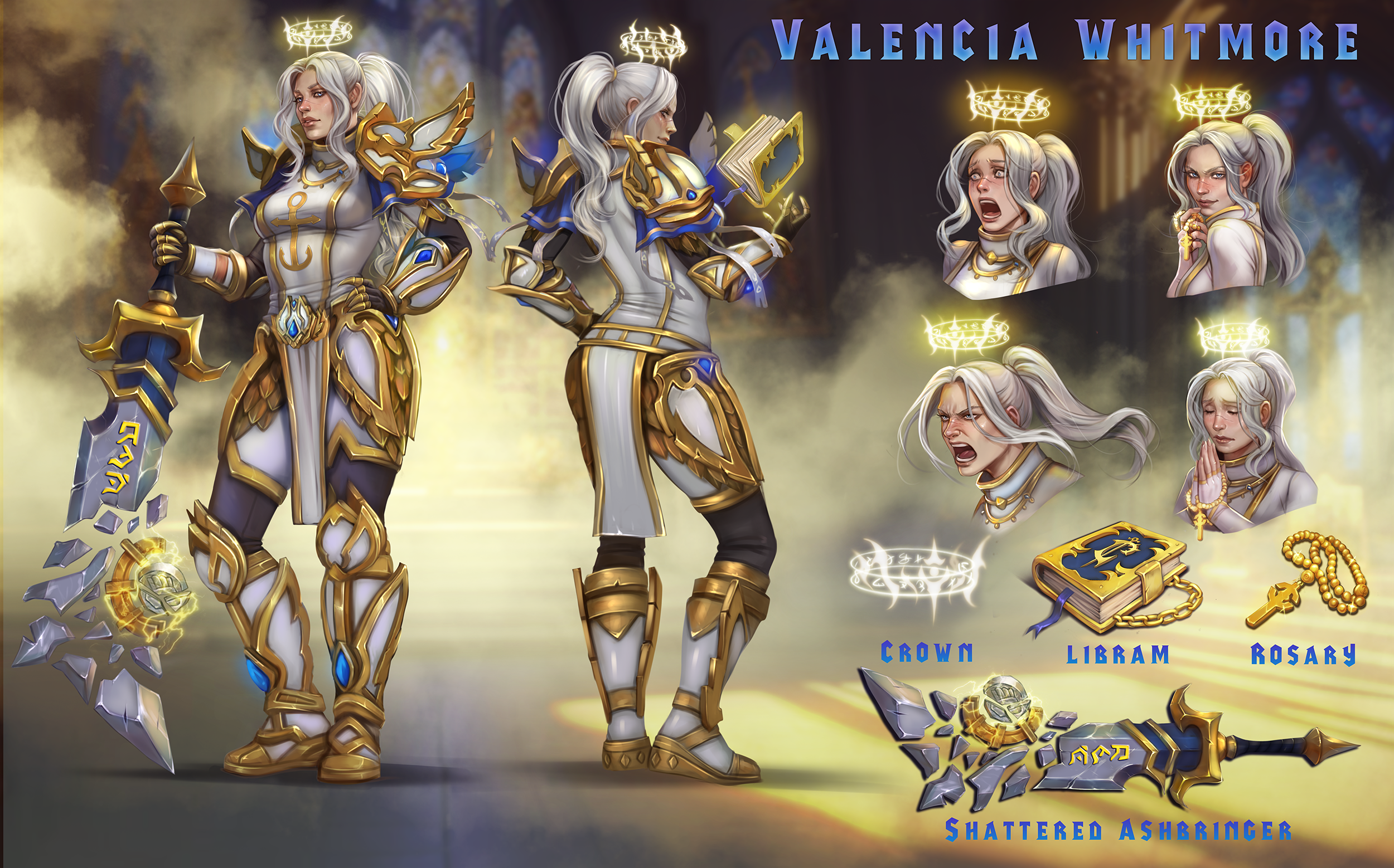 Even though she was barely five and a half feet tall, the presence the woman commanded made her stick out in a crowd. Wisps of white hair gently swayed across her face, an interesting compliment to the paleness of her skin. Careful, attentive eyes surveyed the scene around her, no detail seeming to go unnoticed by the Paladin. Every step she took seemed to have importance, the woman always seeming to be busy going one place or another.Despite the heavy plate armor she wears, she carries herself with grace. This in of itself is a testament to her strength; the armor not seeming to hinder her in any aspect. Indeed it seems to just be another extension of her, something that had been apart of her her entire life. She is prepared, perhaps overly so. She is a master of all aspects of combat as a Paladin, be it defending her allies, healing them, or striking out at her enemies. Each role she has found a set of armor and weapons appropriate to the task, each one distinct to anyone familiar with her.